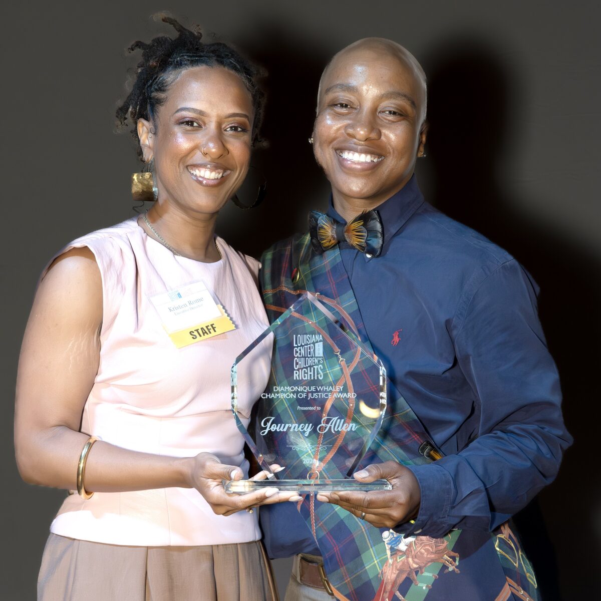 Our guests also helped us present Journey Allen, Local Artist and the Founder of Spectrum Arts NOLA, with our 2026 Diamonique Whaley Champion of Justice Award. “Journey is a quiet force in New Orleans’ youth justice landscape,” says LCCR Executive Director Kristen Rome. “Her work to engage our most vulnerable young people through art has been transformative and expanded what is possible in our community. She lives her values and stands firm in her commitment to using imagination as a conduit for personal and collective liberation. I’m so grateful to work alongside her as we reimagine youth justice in New Orleans and beyond.”